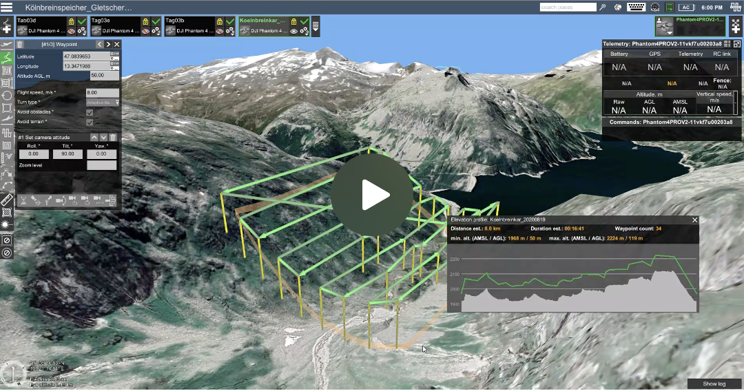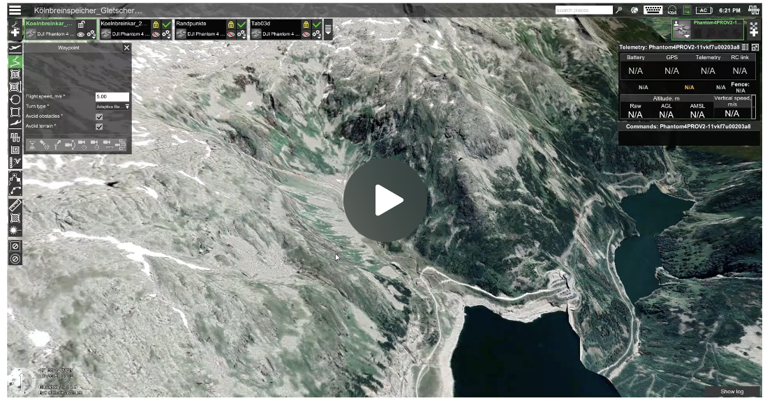Für einfache Befliegungen, die dem Zweck der Aufnahme von Fotos zur Nachweisdokumentation dienen, werden die Drohnen manuell von unseren Piloten gesteuert. Im Falle einer flächendeckenden Geländeaufnahme erfolgt zur Vorbereitung eines Drohnenfluges zunächst eine digitale Flugplanung. Hierzu wird ausgehend vom Startpunkt (Standort des Drohnenpilotes, grüne Stecknadel) ein Polygon abgesteckt (gelbe Linie & gelbe Stecknadeln), welches die Außengrenzen der zu befliegenden Fläche darstellt. Im Anschluss wird eine möglichst akkufreundliche Flugstrecke der Drohne in Abhängigkeit des Geländes definiert. Am Ende der Flugplanung sind die Gesamtfläche sowie die Abmessungen der zu befliegenden Fläche digital ersichtlich. Zusätzlich werden die Flughöhe, Überlappung und weitere Parameter definiert, durch die sich u.a. die Auflösung der Fotos und die Häufigkeit des Auslösens der Kamera ergeben. Die Parameter sind bestimmend für die einheitliche Qualität der digitalen Geländemodelle und Orthophotos.